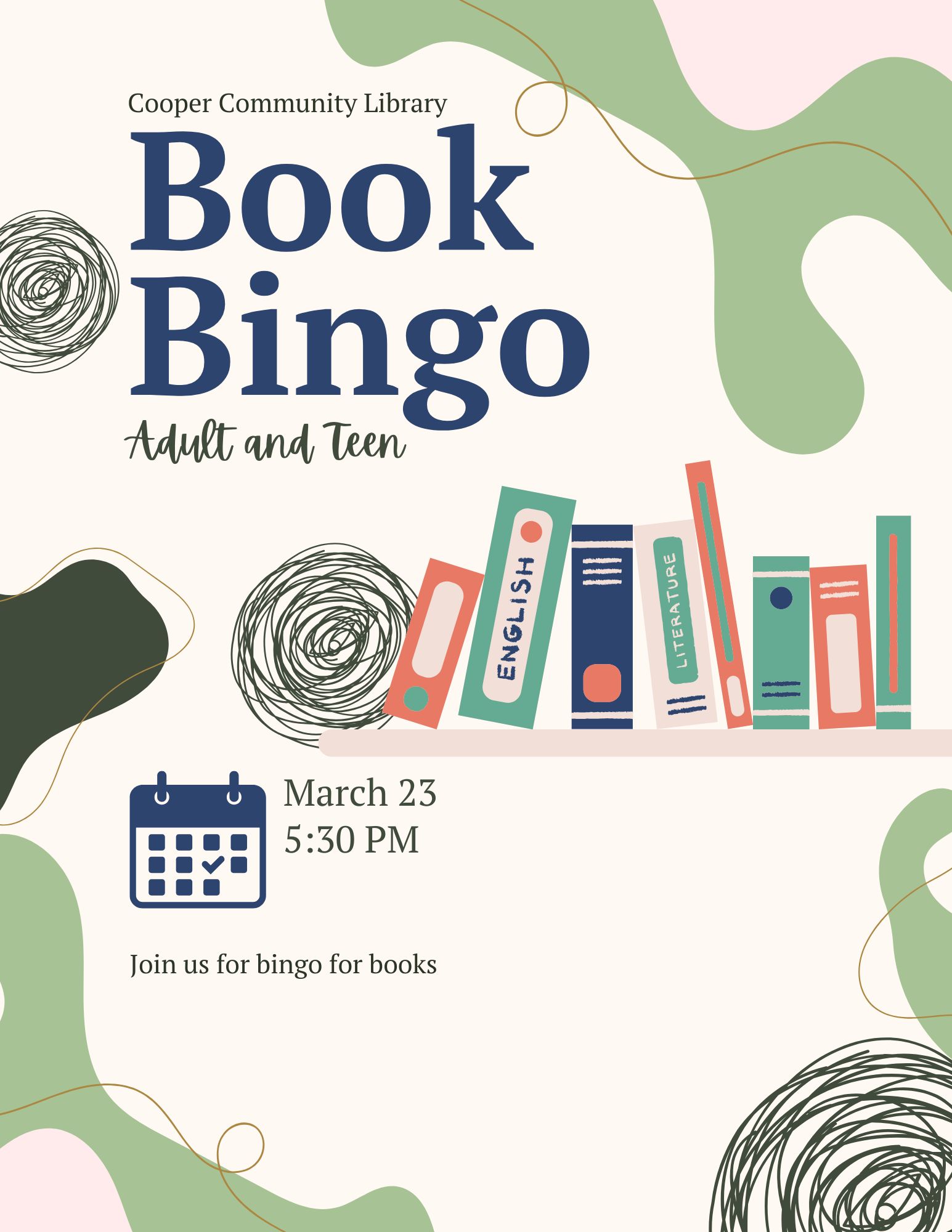 Cooper Community Library Teen and Adult Book BingoJoin us for Teen and Adult Book Bingo, a fun and relaxed event for readers who love a good game and a great read. Books are prizes! Discover new titles, connect with fellow book lovers and enjoy and exciting evening celebrating the joy of reading.Location: The Cooper Community Branch Library |